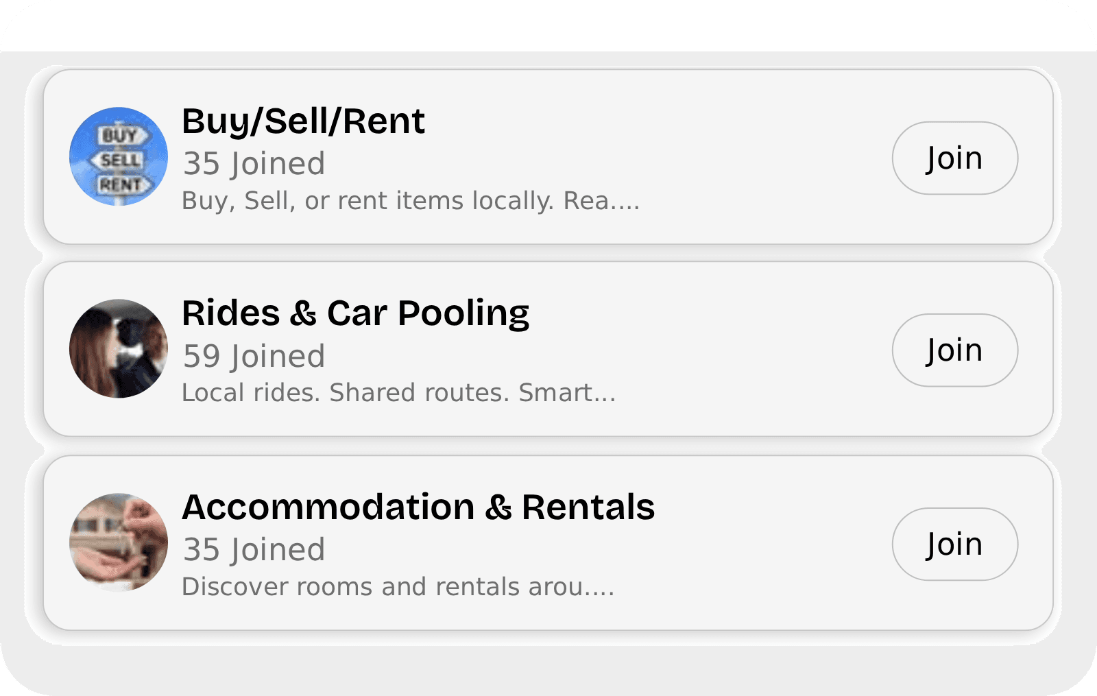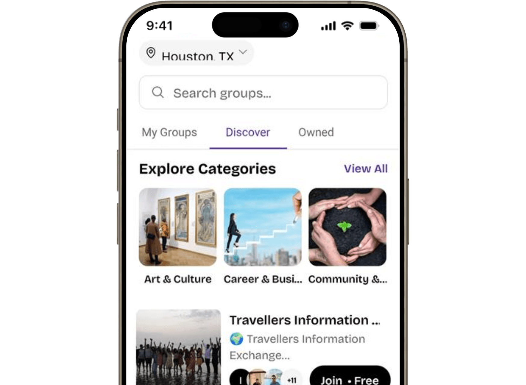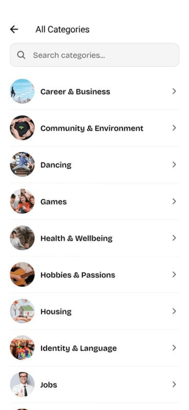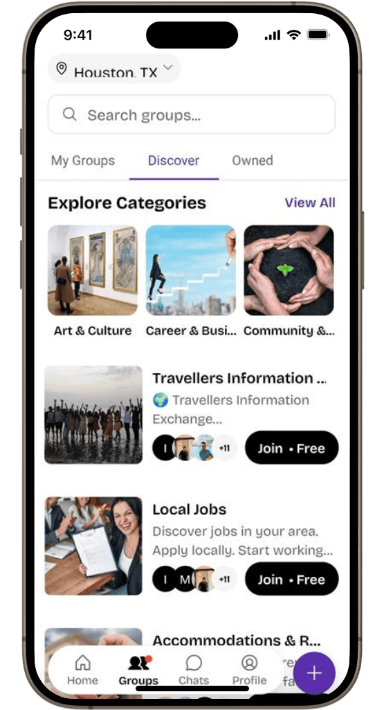 Find and join communities around your interests, profession, or city — no invite links needed.