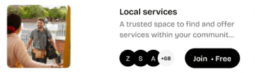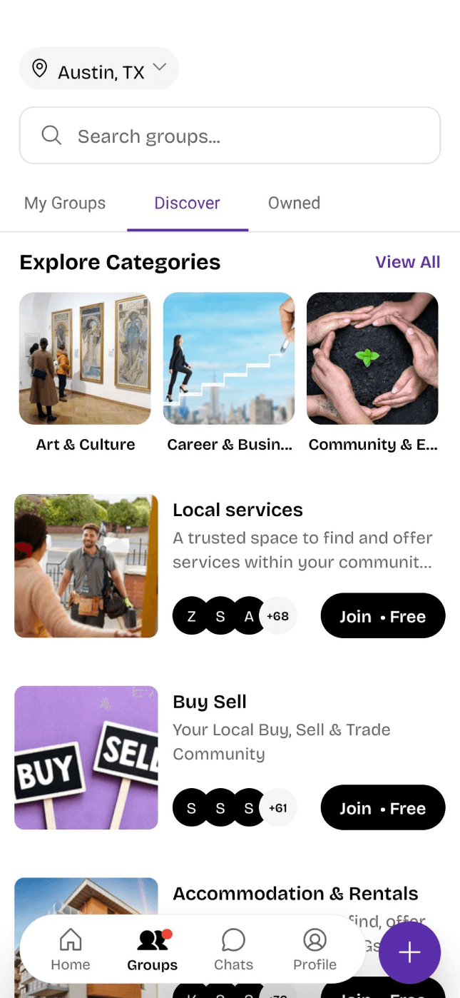 Join groups built around startups, jobs, buying & selling, hobbies, local events, and more.