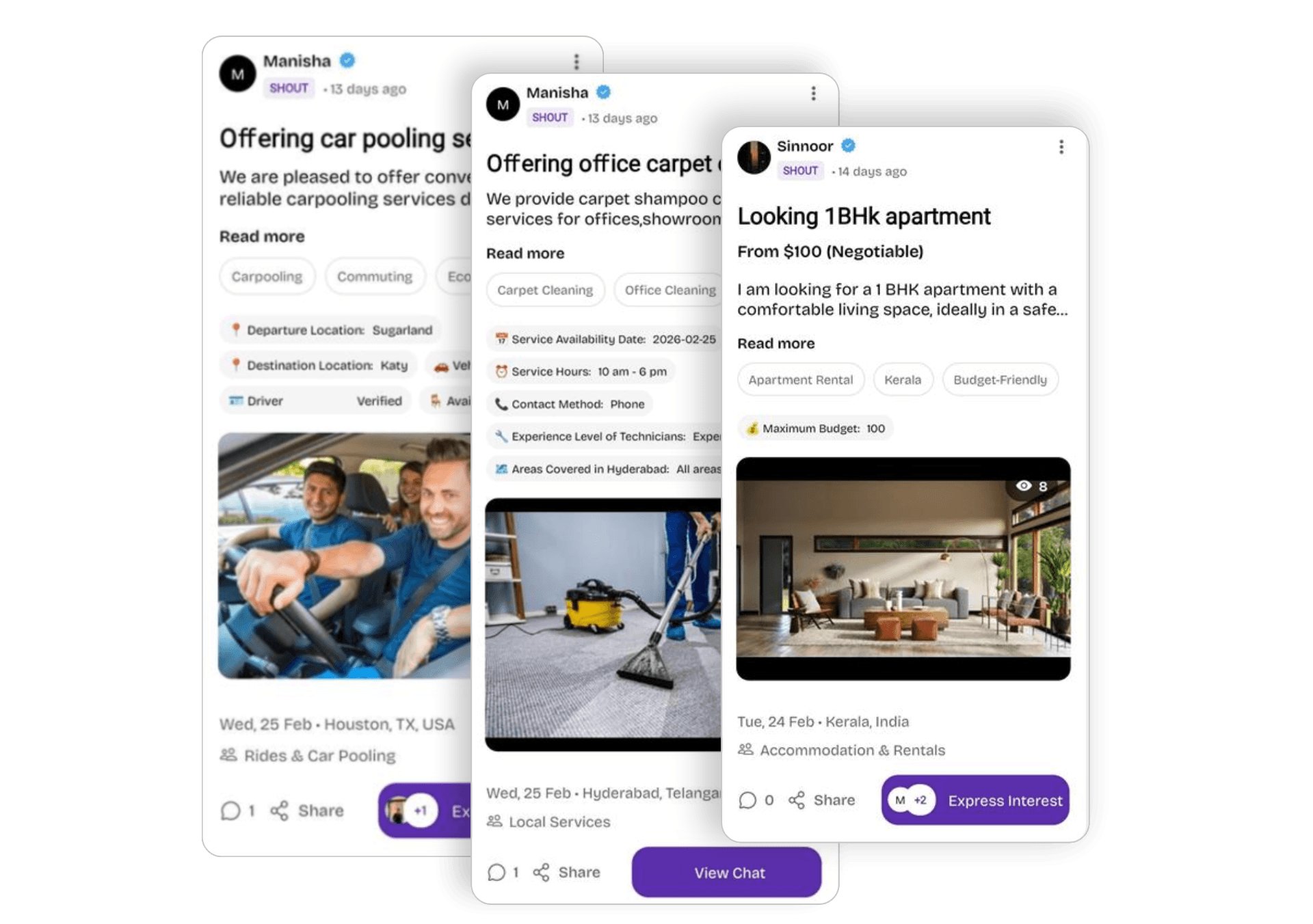 Posted a quick Shout and received multiple recommendations from neighbors within minutes.